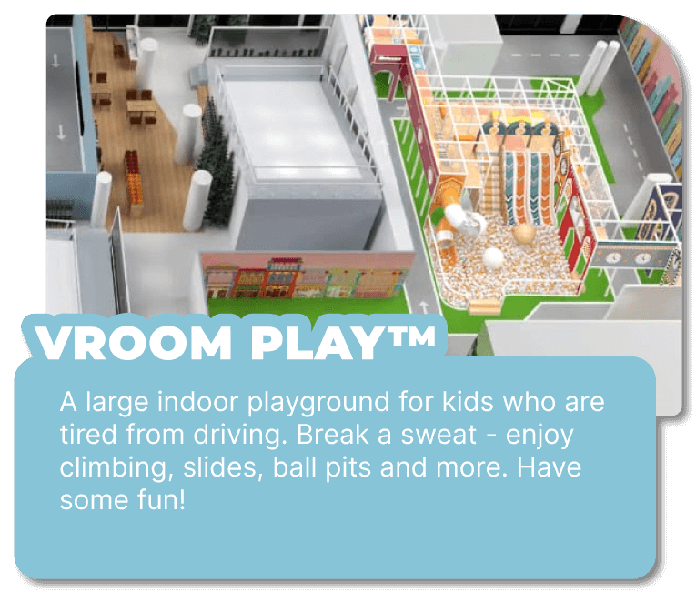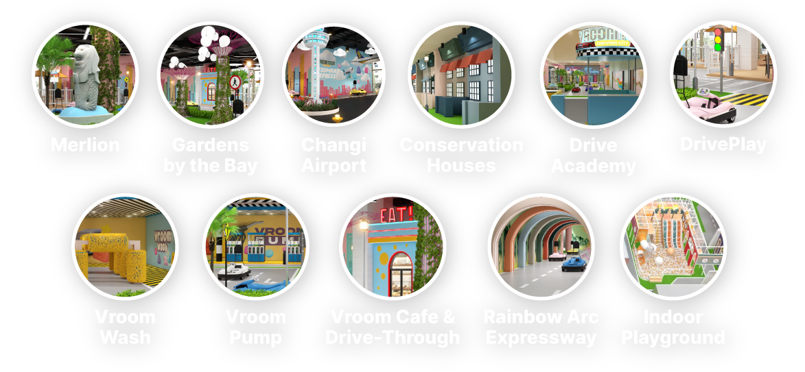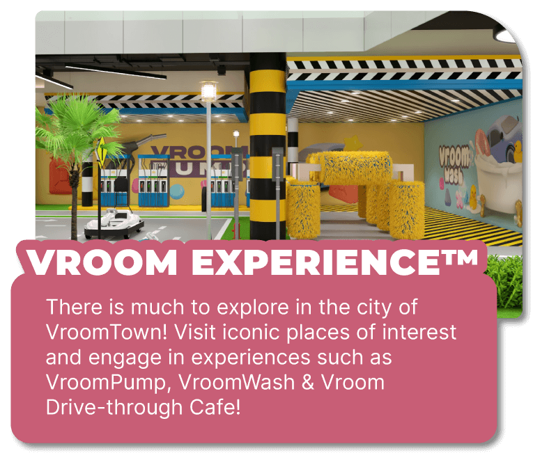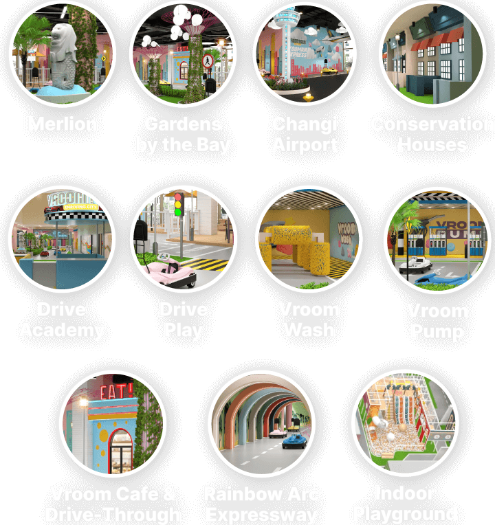 Located in Marina Square, VroomTown™ is a mega indoor drive-play city and playground featuring multiple Singapore icons including the Merlion, Gardens by the Bay and Changi Airport!