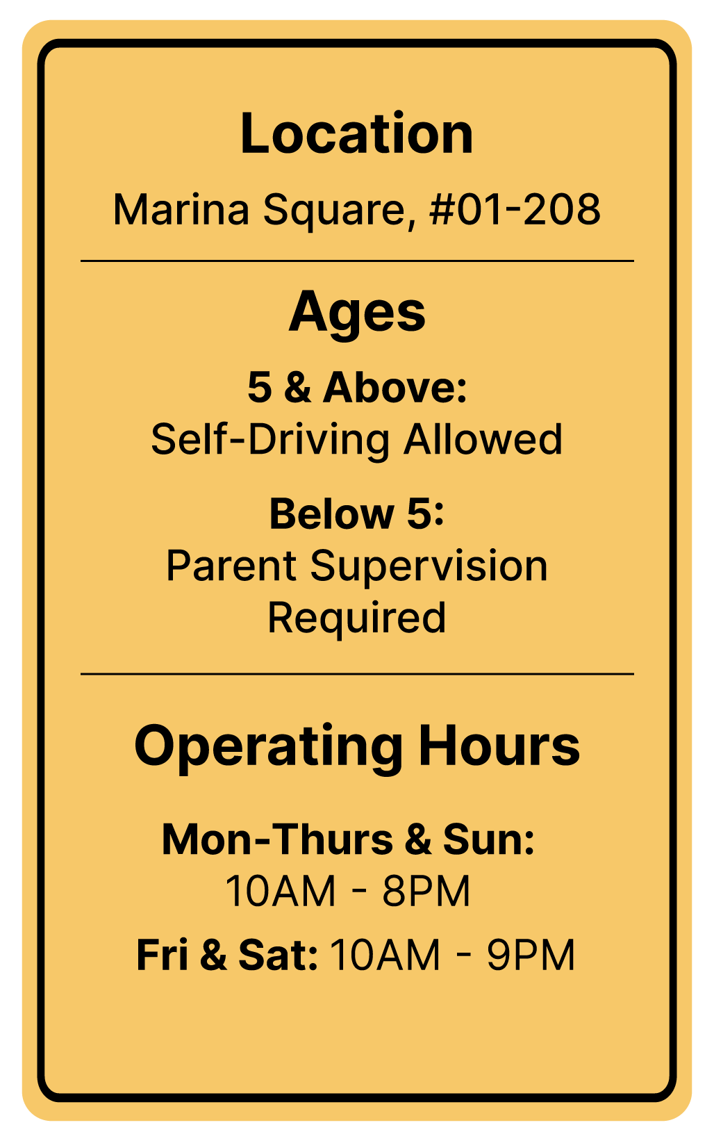 Each drive session is 1 hour. Do note that kids will have to undergo a 10 minute basic driving & road safety lesson on first visit. You can also opt to extend the session further if its available!